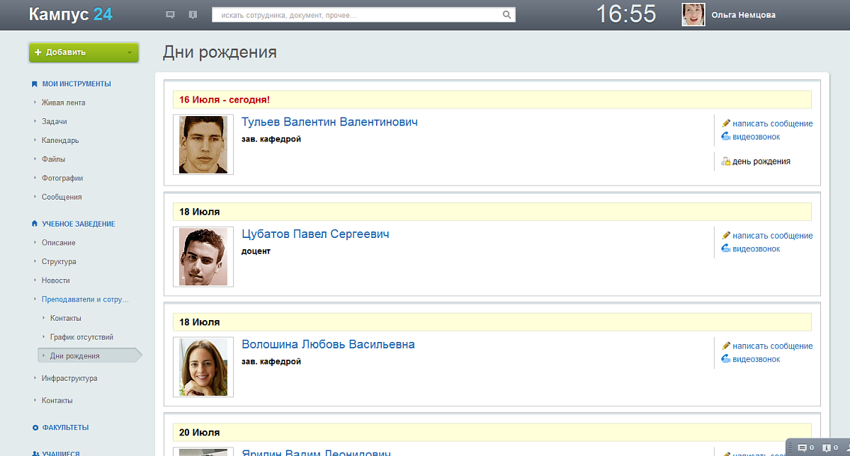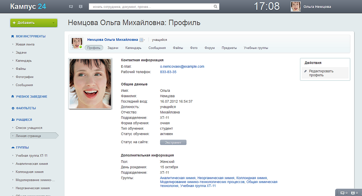 • Найти людей в социальной сети учебного заведения (преподаватели,  одногруппники, другие учащиеся, выпускники), посмотреть контактную информацию, отправить сообщение