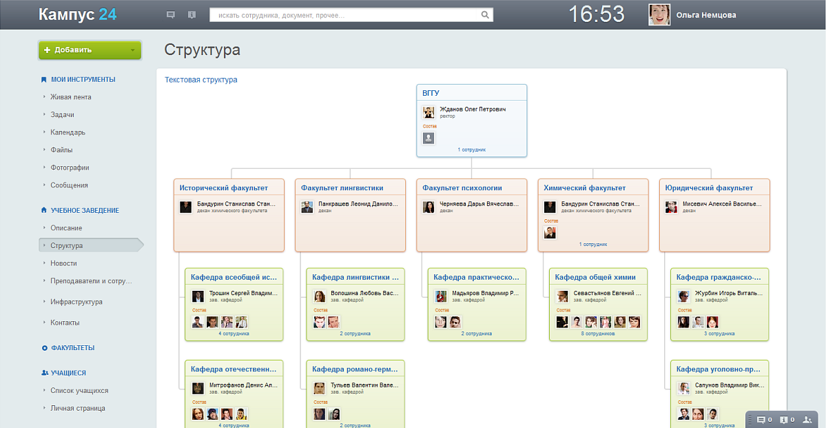 • Посмотреть структуру учебного заведения (факультеты/кафедры/администрация), информацию о ключевых персонах;