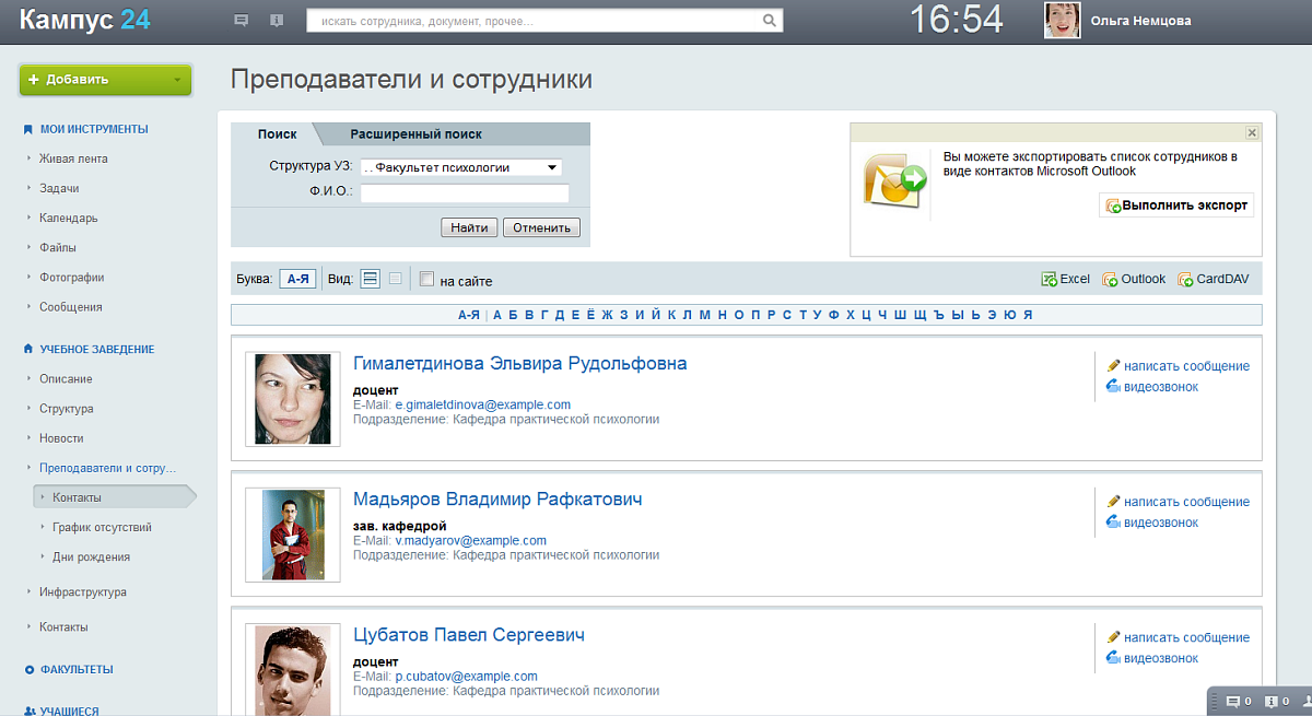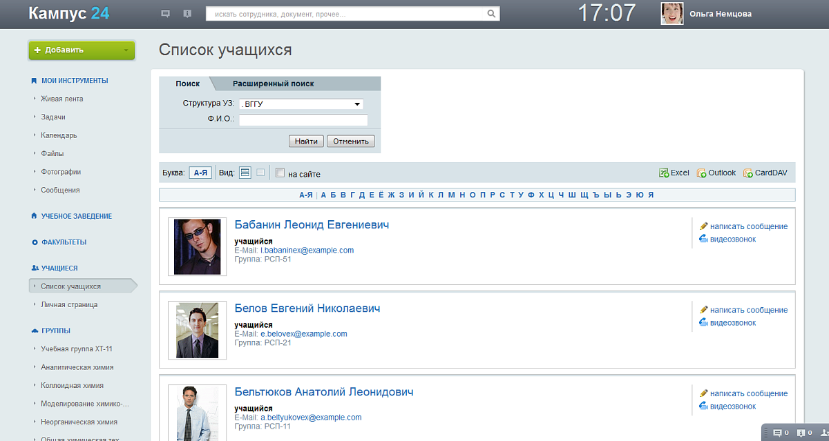 • Поиск контактов (учащиеся, выпускники) и коммуницирование с ними;