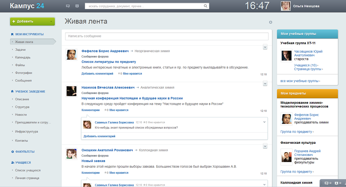 • В предмете найти преподавателей, материалы, получить задания (материалы заданий), отчитаться за выполнение заданий, посмотреть оценку получить комментарии преподавателя;