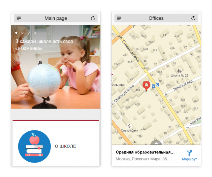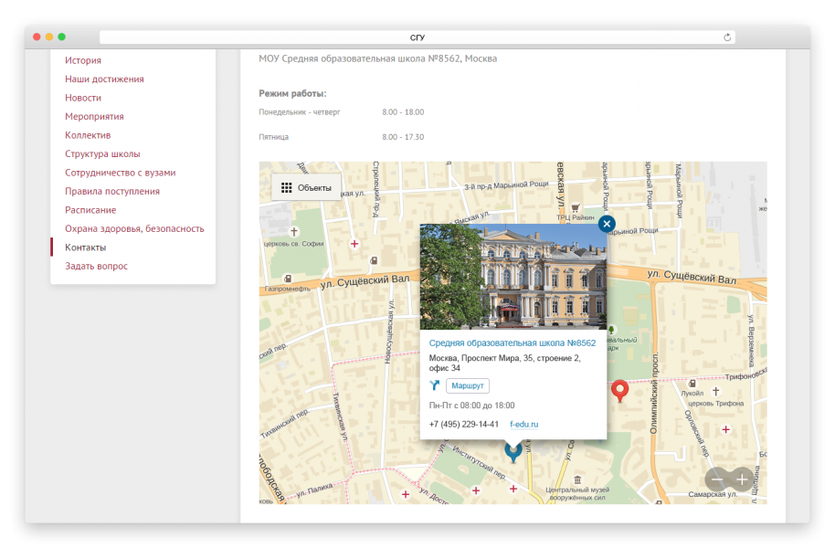 В решение «1С-Битрикс: Сайт школы» интегрирован модуль «1С-Битрикс: Интерактивная карта объектов», с помощью которого пользователи легко могут найти нужное подразделение или филиал образовательного учреждения, уточнить справочную информацию, проложить маршрут.