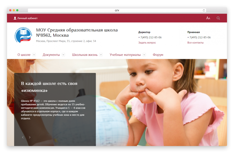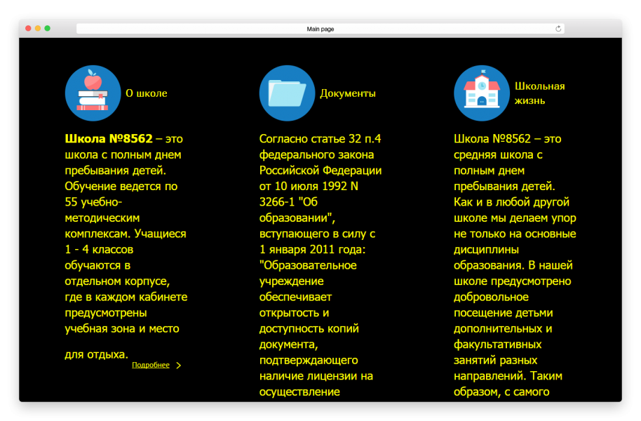 Сайт полностью готов: реализован шаблон дизайна, новая структура, разделы «О школе», «Родителям», «Ученикам», «Учителям». То есть нет необходимости разрабатывать дизайн и структуру сайта, нужно только заполнить данные.