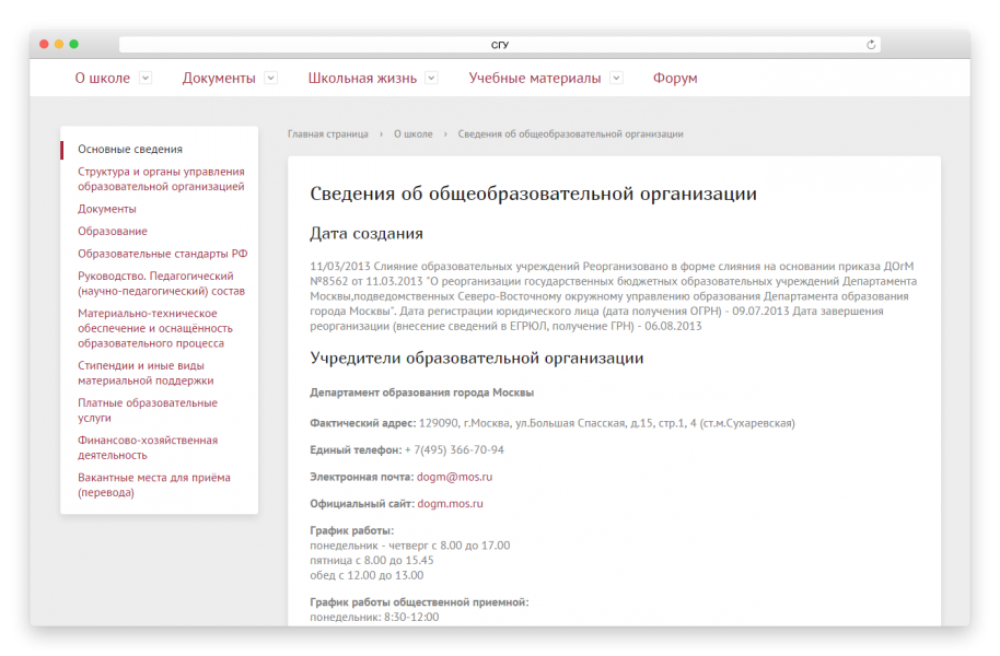 Базовый функционал служит для создания сайта –визитки среднего общеобразовательного учреждения.