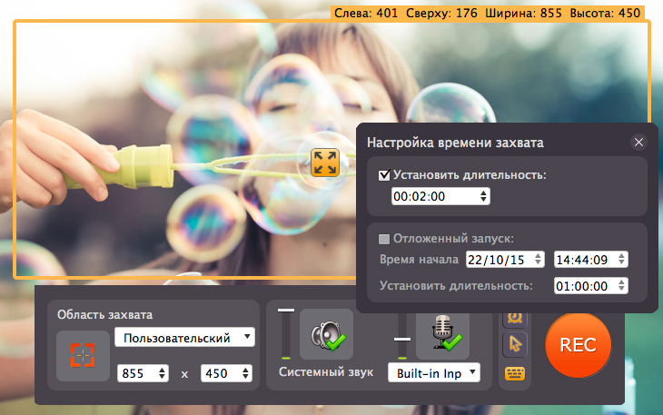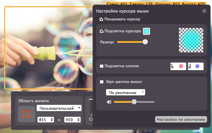 - Управляйте записью с помощью горячих клавиш и панели на рамке захвата