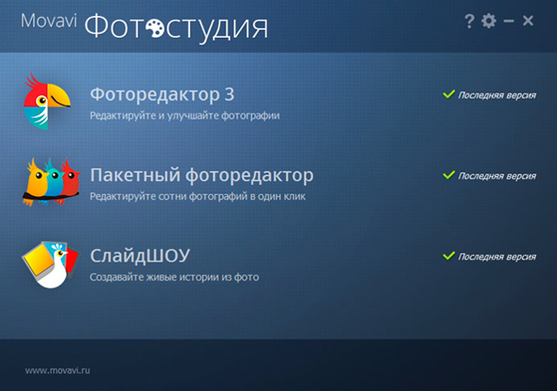 Movavi Фотостудия – это набор полезных программ для обработки фотографий. Фотостудия состоит из трех приложений (модулей): Фоторедактора, Пакетного Фоторедактора и СлайдШОУ, а также программы запуска. Чтобы открыть нужный модуль, нажмите на него в программе запуска.